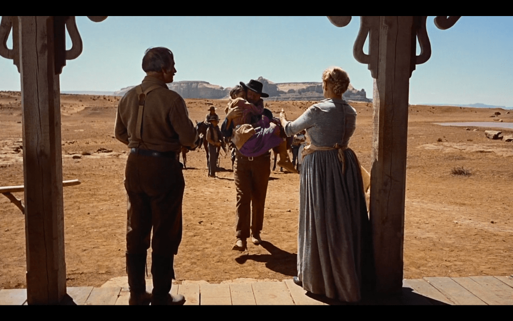 However, as alluded to in the shot’s description, the opening image’s framing draws attention to this clear division created between these two spaces. In doing so, the film highlights its construction, opening the filmic image, set in 1868 Texas, to 1950s America. So, the interior/exterior dichotomy becomes as much about the Television versus the Hollywood Western in the 50s. In that, the silhouette inside the house feels literally squished by the door’s outline, which may not precisely replicate the Television’s 4:3 aspect ratio but does mimic its boxiness. The film’s critique of the televisual image’s inability to provide an expansive view of the West becomes most evident as the camera moves from the house to the porch. It highlights the filmic camera’s ability to break through these margins that stop the viewer from experiencing the West in its widescreen glory.