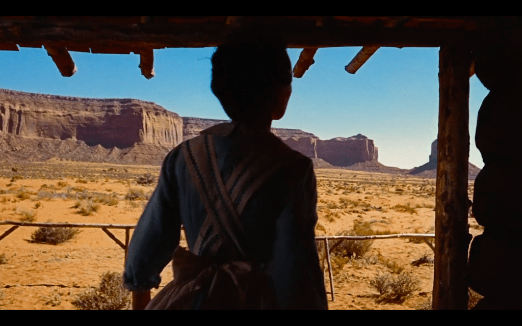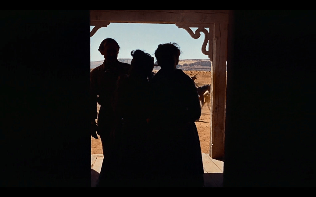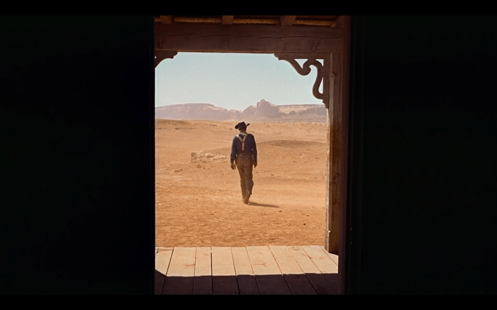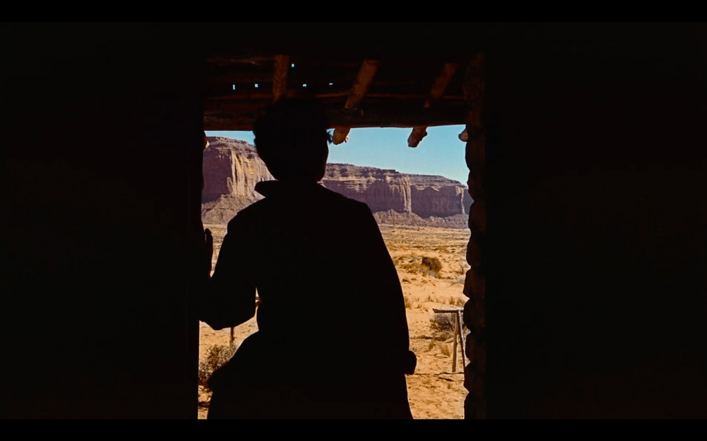 There is no triumph in this, however. The film conveys it as simultaneously mournful and contemptuous. The sight of Ethan walking away from the camera, combined with the gentle humming of “Ride Away,” produces an operatic effect. It laments his existentialism, his desire to continue to search the land for answers even when they lie right in front of him. However, his increased distance from us also allows for a critical lens. We return to the first image. Again, the foreground is pitch black, the door’s outline signifies the division between it and the middle ground, and the West’s Horizon is Technicolor. Rather than moving with Ethan, the camera remains fixed within the house. The camera’s refusal to follow makes him appear small. Lastly, the door, initially welcoming, also respectfully closes. Like Ethan, this New World of mutual understanding, too, can exist without him.