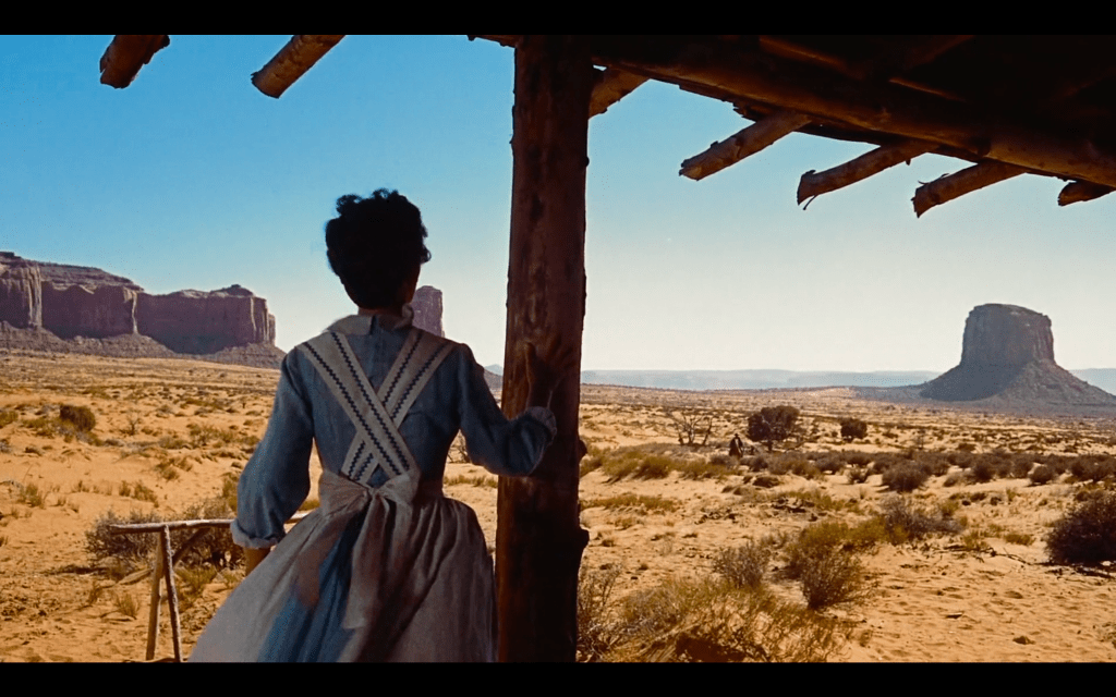 The first image is of a silhouette opening the door to half-reveal the Western landscape in its full Technicolor glory. For the first five seconds, the camera observes this figure (we now assume it is a woman because of the shape of the outfit she is wearing), standing in between the interior and exterior. In other words, the camera captures her resting her hands on the door, sandwiched by the foreground’s pitch blackness and the background’s vibrant colors. Gradually, she moves outside toward the wide-open horizon. The camera follows suit. Its push into this exterior space literally extends the frame because the door’s outline no longer confines it.